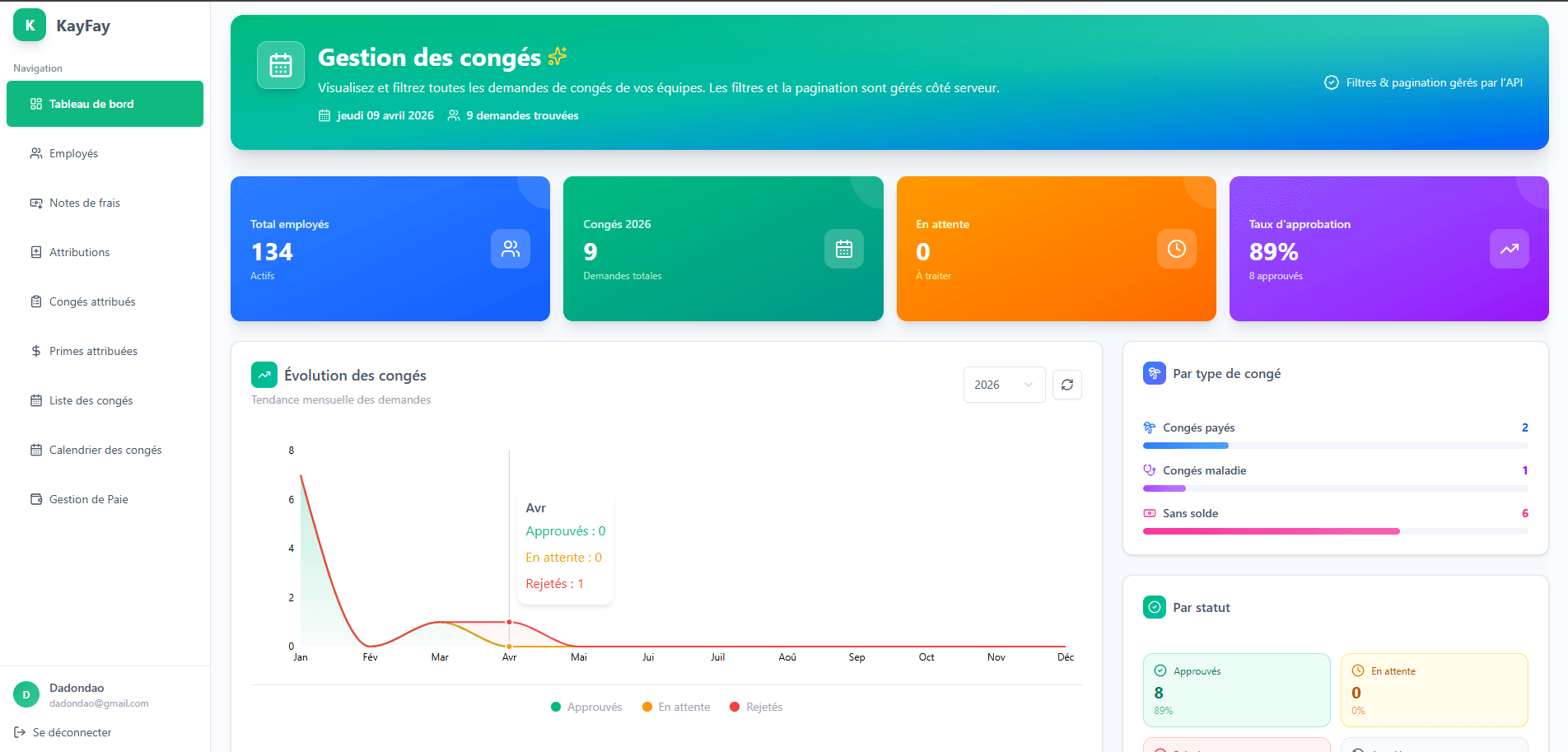 Kayfay déroule maintenant toute la chaîne RH avec des écrans plus solides: employés, congés, calendrier et paie détaillée avec PDF visible.